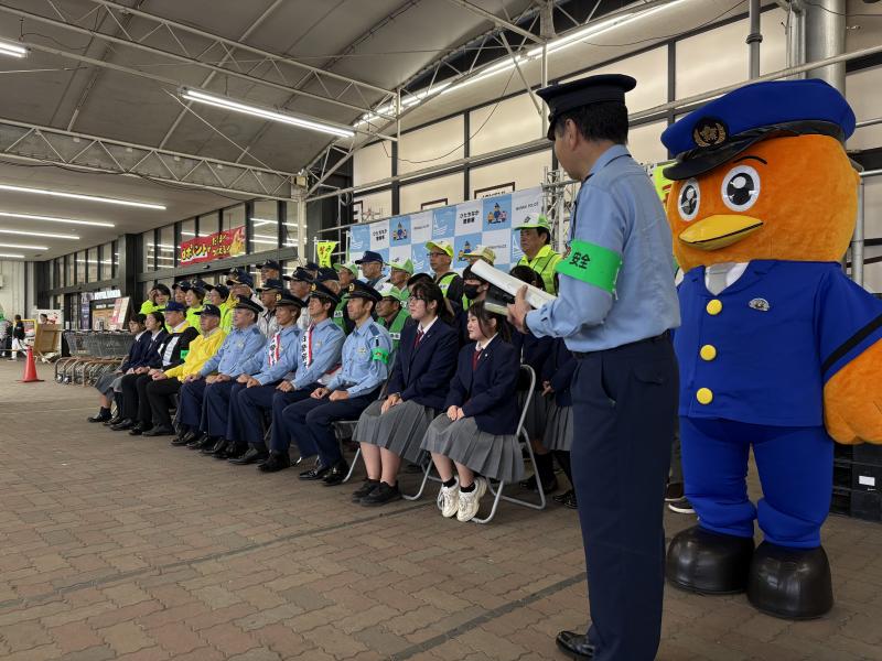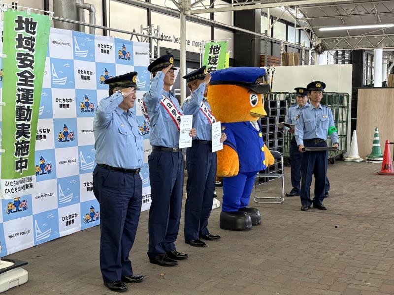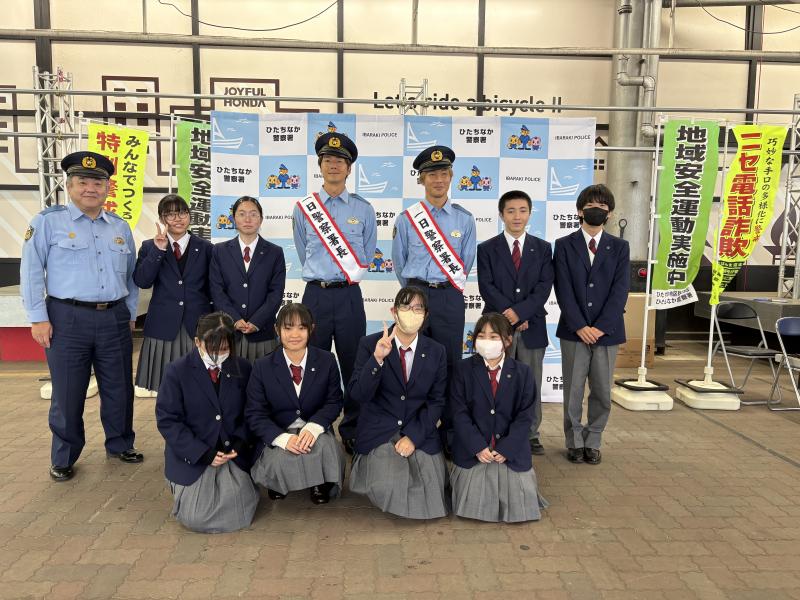 令和7年10月9日(木)に、ジョイフル本田ニューポート店で行われた、防犯キャンペーンに参加ました。このイベントは、11日から始まる全国地域安全運動に先駆けて実施されたものです。ひたちなか署の一日署長に任命されたJ2水戸ホーリーホックの飯田選手、塚川選手、茨城県警マスコットのひばりくんらと一緒に、同店の出入り口付近で啓発グッズを配布しました。ひたちなか地区では、詐欺や空き巣、自転車盗難が増えているそうです。皆さんも気を付けましょう!