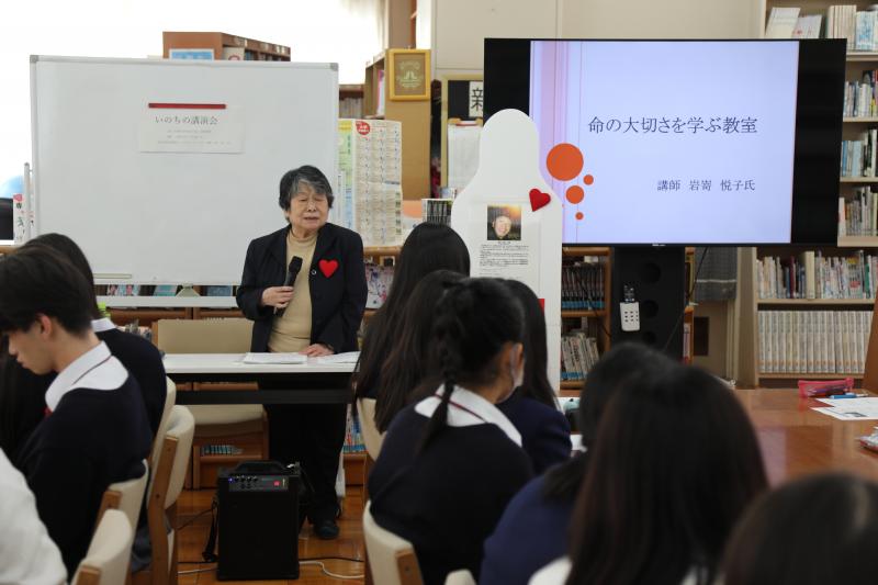 令和7年10月15日(水)に、特定非営利活動法人 いのちのミュージアム 理事 岩嵜 悦子先生にご来校いただき全校生徒による「いのちの講演会」を実施しました。ご自身の息子さんを交通事故で亡くされた思いを聞くことができました。息子さんの身長と同じ等身大のパネルを前に「月日がたてば事故のショックや心の傷は癒えても、消えはしない」と声を詰まらせながら話していただいた言葉がすごく印象に残りました。悲しい思いをする被害者を作らないために、加害者にならないこと、自分の命も他の人の命も大切にして生活していきたいと思います。