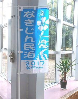 【中央】多目的ホールには修学旅行から戻った2学年が民泊先(今帰仁村)から頂いた幟り旗が飾ってありました。きっとたくさんの思い出を作ってきたのでしょうね。