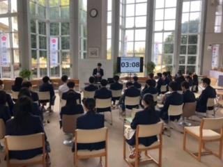 11月19日(木),11月26日(木)の両日,3年生「国語表現」(山田先生・横山先生)の授業で、ビブリオバトルの決勝戦を行いました。5人の発表者の中からチャンプ本が決まります。11月19日は『5分後に意外な結末』(桃戸ハル著),26日は『ボッコちゃん』(星新一著)が選ばれました。
