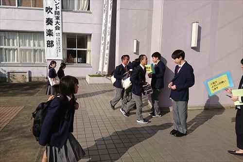 本館正面の生徒昇降口には部活動で関東以上の大会出場の部活動を称える何本もの大きな「懸垂幕」が懸かっています。今年度も早くも3本の幕が掛け替えられました。この日は朗読部の全国大会出場を知らせる懸垂幕が取り付けられていました。