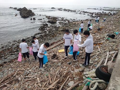 海岸清掃ボランティアを海水浴場の海岸以外に拡大して行ってから今回で6回目ですが、特に、中生代白亜紀層磯崎海岸の清掃に3年間参加した生徒から「2年前から比べたらゴミが少なくなった」という感想があり、ひたちなか市の海岸、及び海をきれいにする目的の海岸清掃のボランティア活動も成果が出てきたようです。