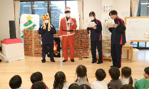 令和6年12/22、26、27、おーくす佐野保育園でボランティア活動を行いました。今回は、延べ45名が参加し、クリスマス会、保育手伝いのボランティア(園児とのふれあい)、落ち葉拾い等の清掃ボランティアを行いました。クリスマス会では、寸劇の「サンタが保育園にやってきた」を演じて、プレゼントを渡しました。園児たちは大喜びでした。