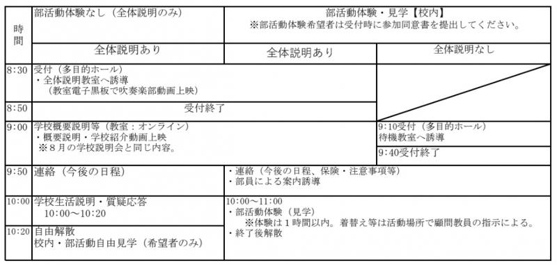 (男女バスケットボール・剣道の部活動体験は校外で実施し、現地集合・全体説明なしとします)