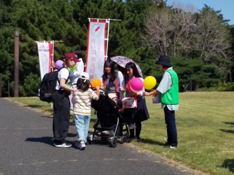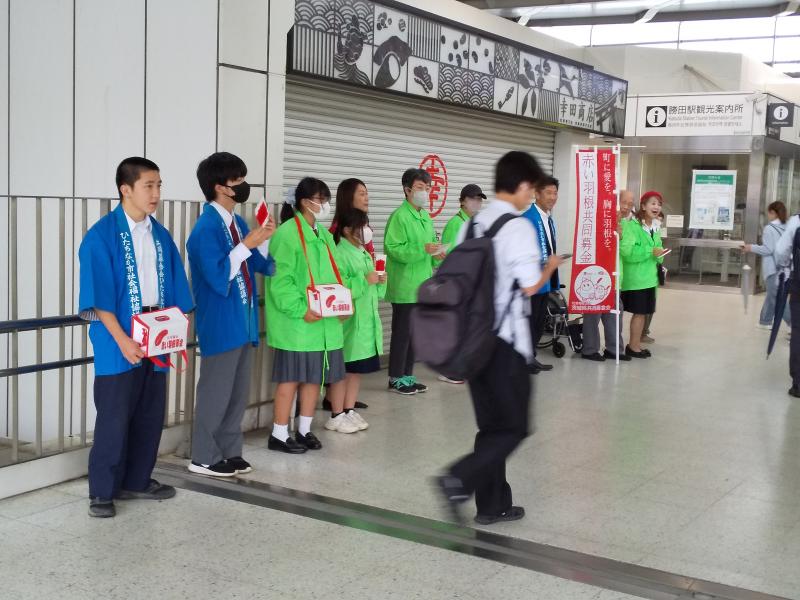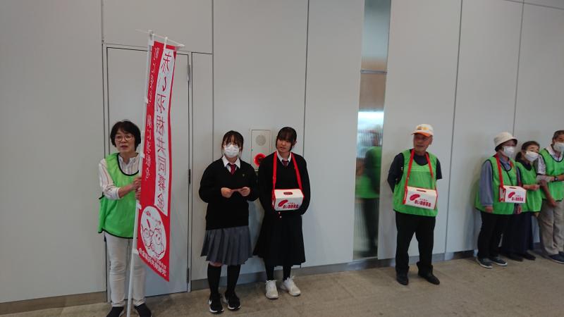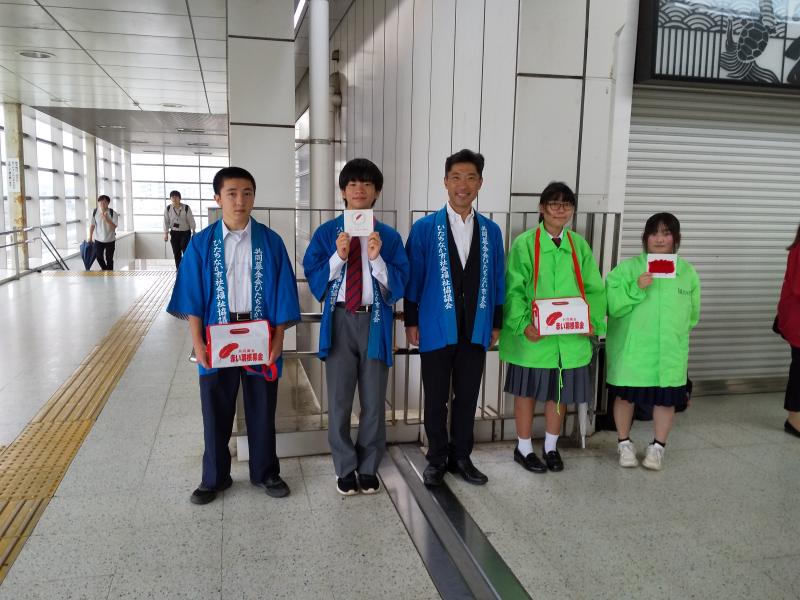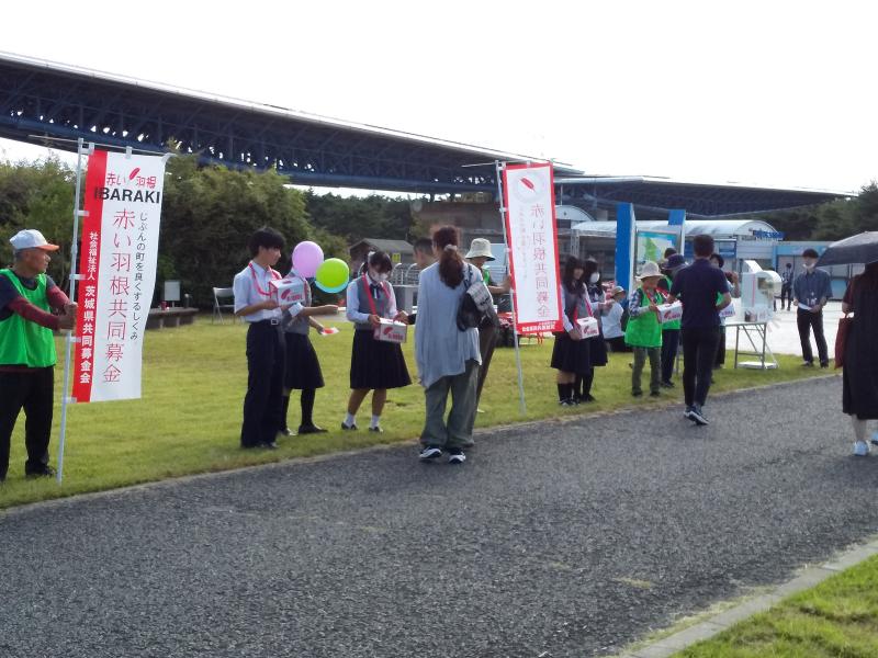 今年度も本校JRC部が、「共同募金運動」のボランティアとして、8名の生徒が参加しました。9月27日(土)は、国営ひたち海浜公園、10月1日(水)は、JRの勝田駅と佐和駅の2か所に分かれ、ボランティアとして共同募金運動のPRと募金協力の呼びかけを行い、募金の受け取りや、募金にご協力いただいた方へ「赤い羽根」をお渡しする活動を行いました。